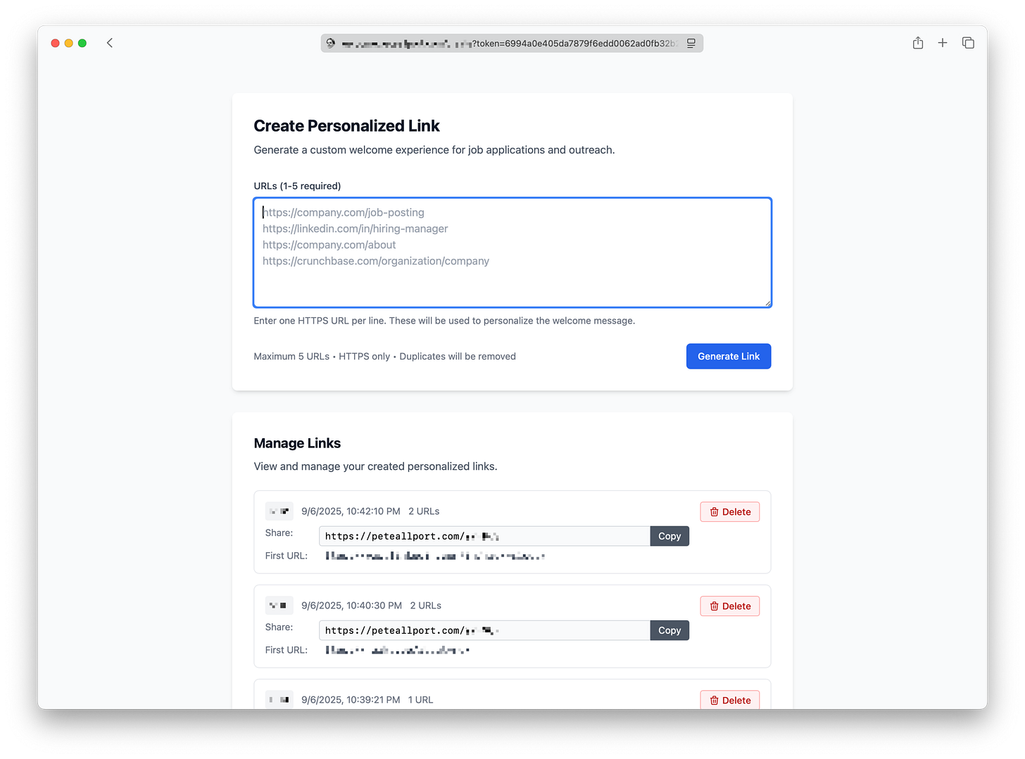 So the workflow is still pretty straightforward. On the admin page, I plop a few links about the individual (and/or company, job posting, or whatever), and hit that Generate Link button. Which returns a personalized peteallport.com link with a slug that I can use anywhere.