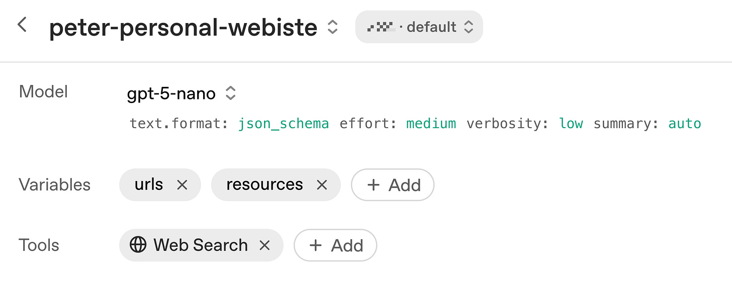 As for the actual inference, I opted for gpt-5-nano which is surprisingly fast for the output quality you get. I had originally developed a custom MCP server with a tool suppling the JSON resources (links) about me, but this proved somewhat overkill and I ran into several known bugs with Responses API using custom MCPs. Consequently, I am using the below configuration. This simply includes prompt inputs (visitor URLs and JSON resources about me) as well as JSON schema structured outputs, and the web search tool . The client (peteallport.com) also uses the same JSON resources, so this approach ensures I have a single, version-controlled source of truth that I can continually add to.